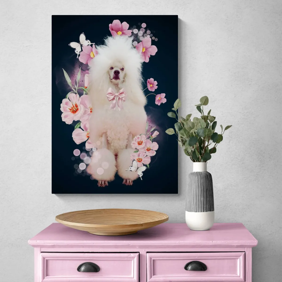Witte Franse koningspoedel omringt door roze bloemen in vintage style. Getoonde prijs is voor canvas 50 x 70 cm. Andere materialen en formaten verkrijgbaar.