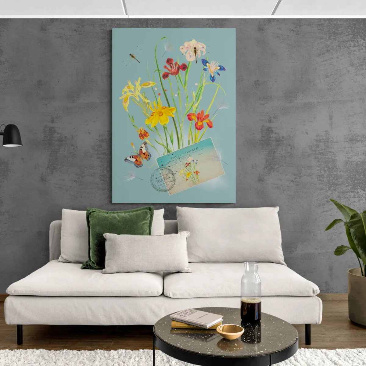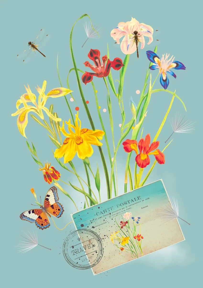 Zomerse dag met kleurige veldbloemen, een vlinder, libellen en een postkaart met dezelfde print. Getoonde prijs is voor canvas 50 x 70 cm. Andere materialen en formaten verkrijgbaar.