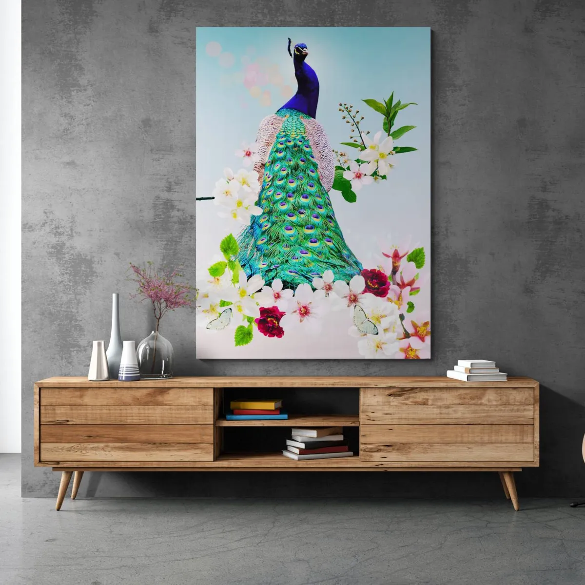 Pauw op een tak tussen de bloesembloemen. Getoonde prijs is voor canvas 50 x 70 cm. Andere materialen en formaten verkrijgbaar.