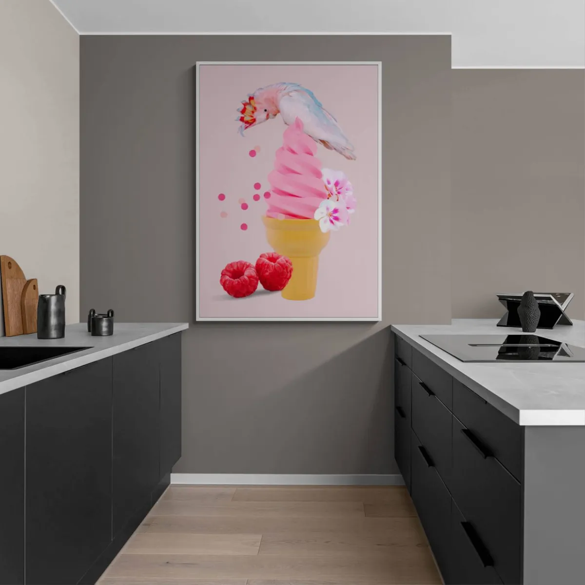 Roze kaketoe op een roze ijsje met frambozen, roze confetti en roze bloesem als extra garnering. Getoonde prijs is voor canvas 50 x 70 cm. Andere materialen en formaten verkrijgbaar.