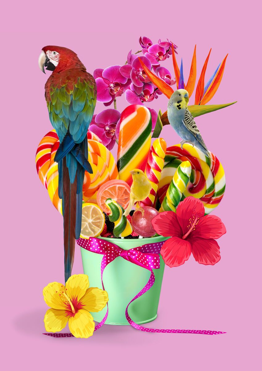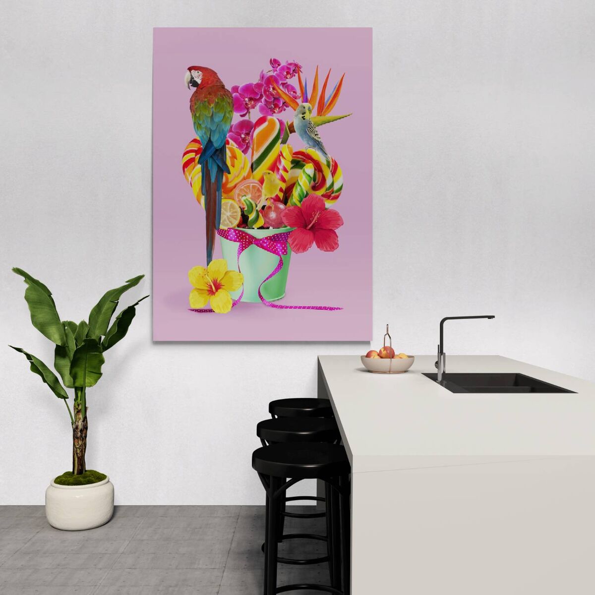 Tropiche vogels op een pot vol met gekleurd snoep. Getoonde prijs is voor canvas 50 x 70 cm. Andere materialen en formaten verkrijgbaar.