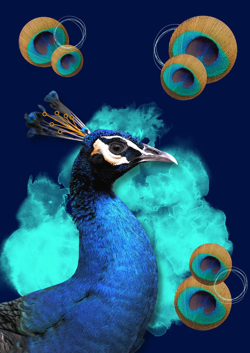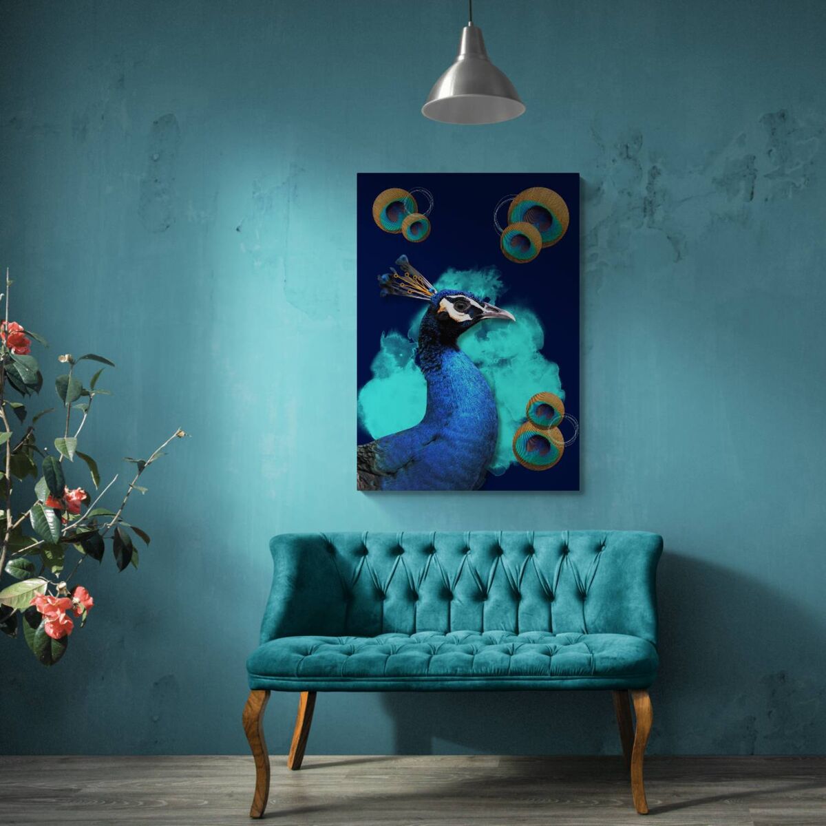 Pauw op blauwe achtergrond met ronde veren. Getoonde prijs is voor canvas 50 x 70 cm. Andere materialen en formaten verkrijgbaar.