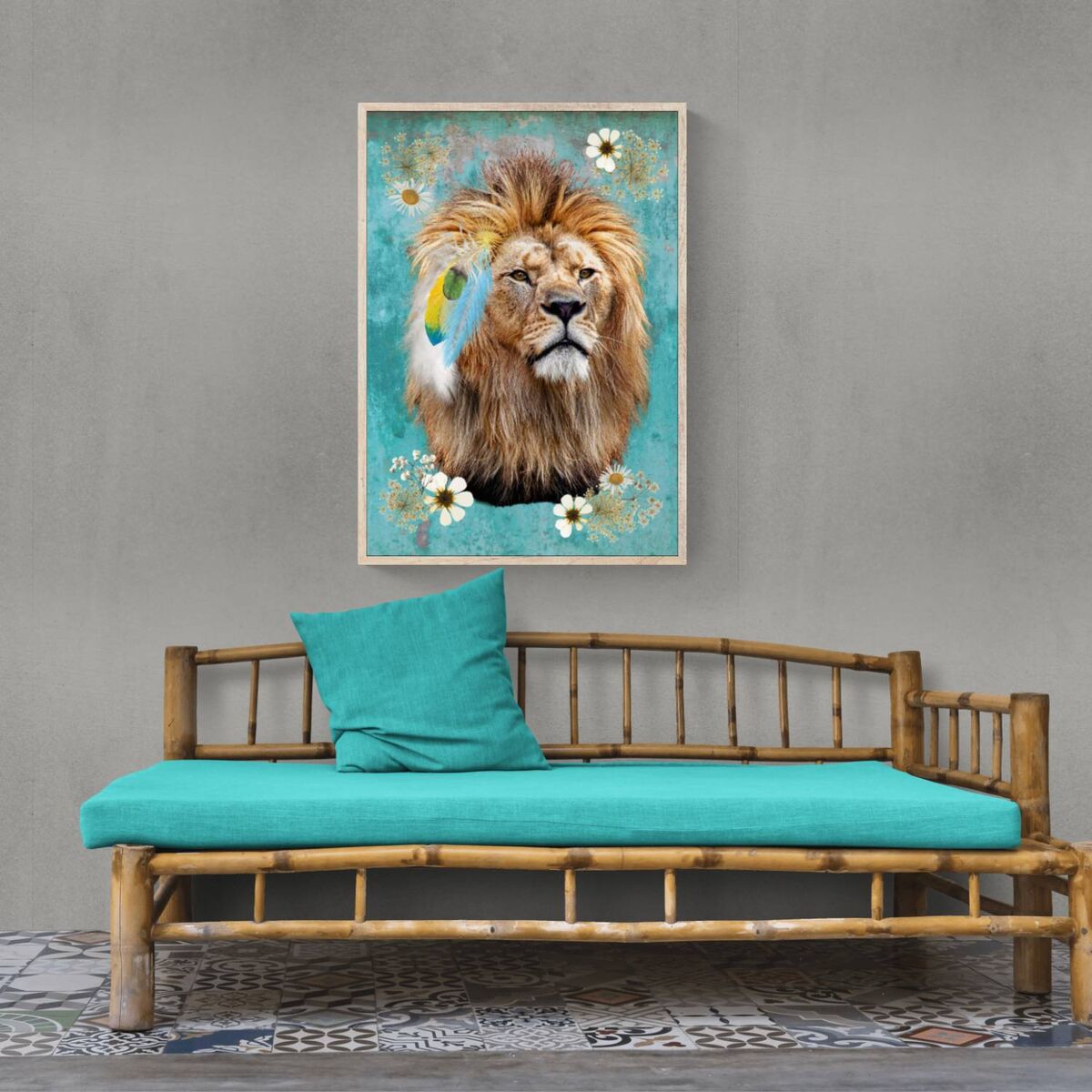 Leeuwenkop met veren op een ruwe turquoise achtergrond met witte bloemetjes in Boho style. Getoonde prijs is voor canvas 50 x 70 cm. Andere materialen en formaten verkrijgbaar.