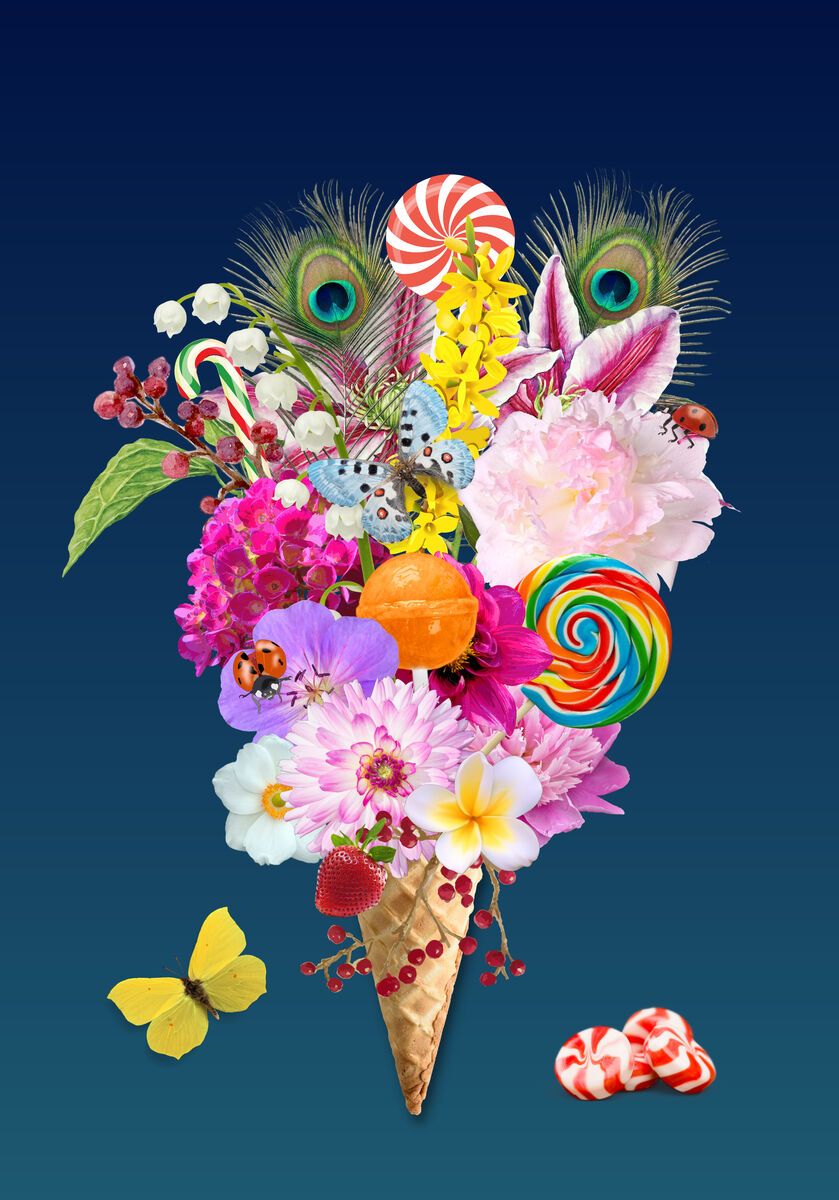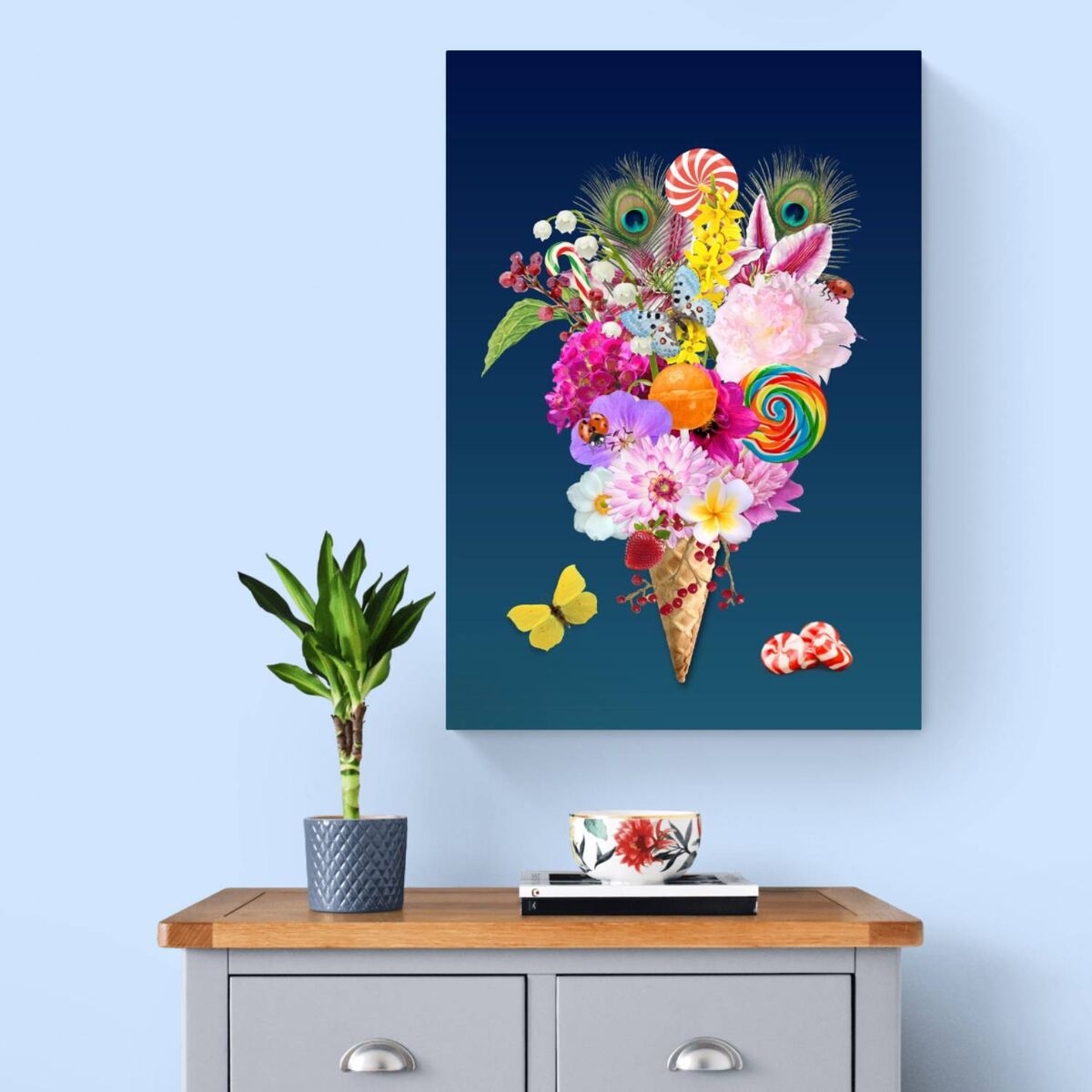 IJshoorntje gevuld met bloemen, veren en snoep in multicolor. Getoonde prijs is voor canvas 50 x 70 cm. Andere materialen en formaten verkrijgbaar.