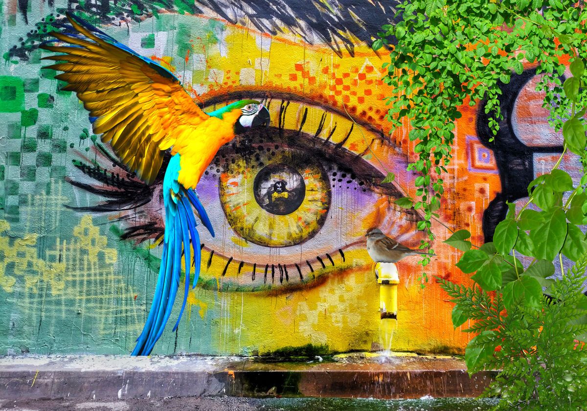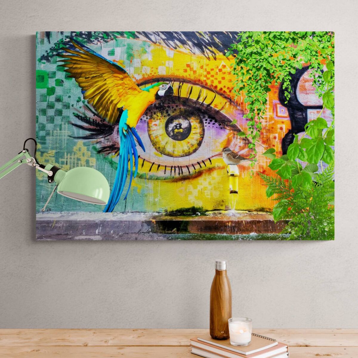 Straat graffiti van een oog met een blauw gele ara (papegaai). Horizontaal ontwerp. Getoonde prijs is voor canvas 50 x 70 cm. Andere materialen en formaten verkrijgbaar.