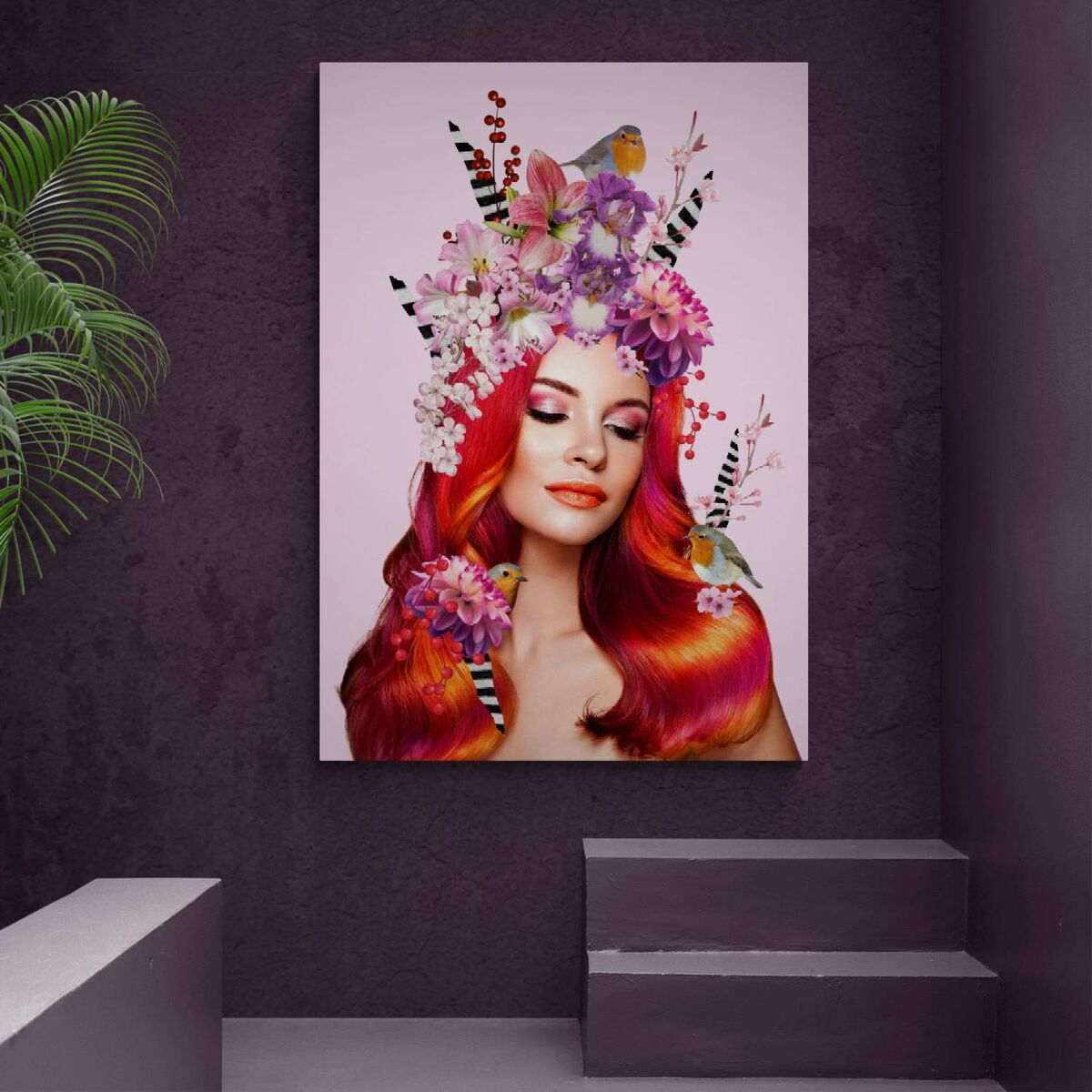Vrouwengezicht met roze en paarse bloemen en roodborstjes. Getoonde prijs is voor canvas 50 x 70 cm. Andere materialen en formaten verkrijgbaar.