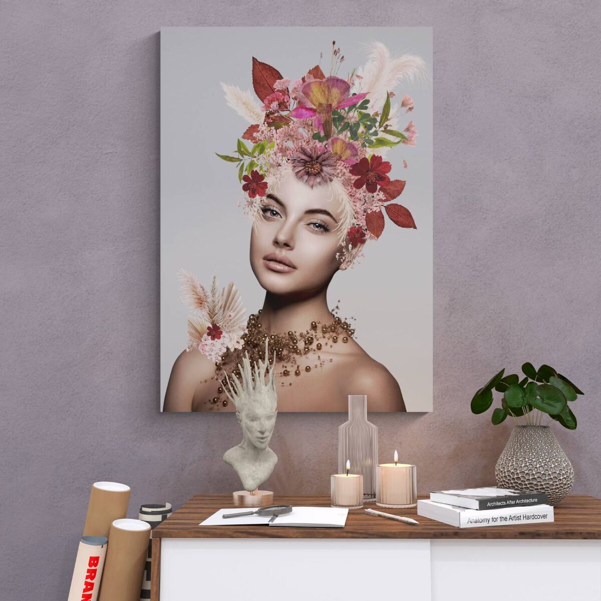 Vrouwengezicht met oudroze en bordeauxrode droogbloemen op een grijze achtergrond. Getoonde prijs is voor canvas 50 x 70 cm. Andere materialen en formaten verkrijgbaar.