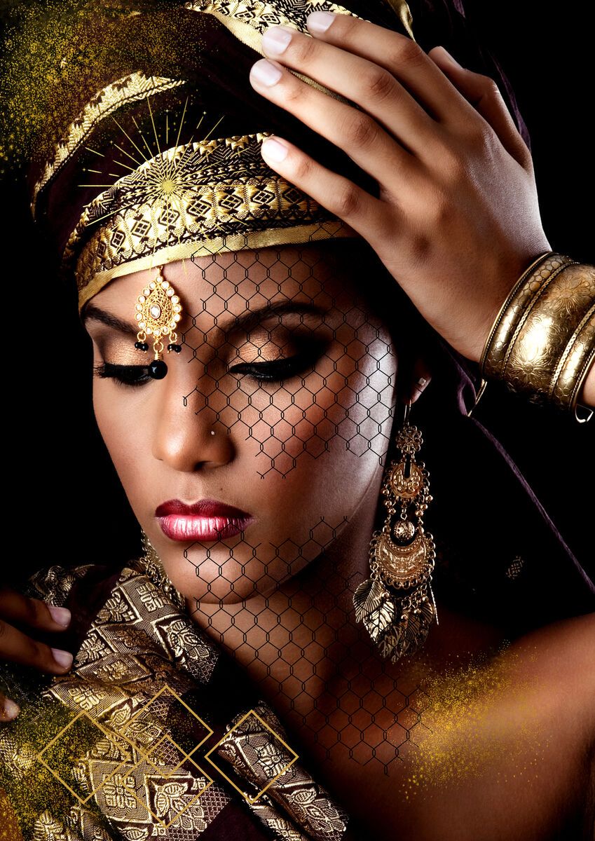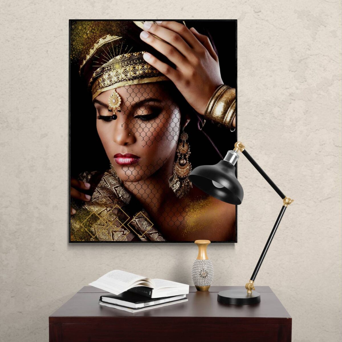 Vrouwengezicht met etnische elementen in zwart- en goudkleuren. Getoonde prijs is voor canvas 50 x 70 cm. Andere materialen en formaten verkrijgbaar.