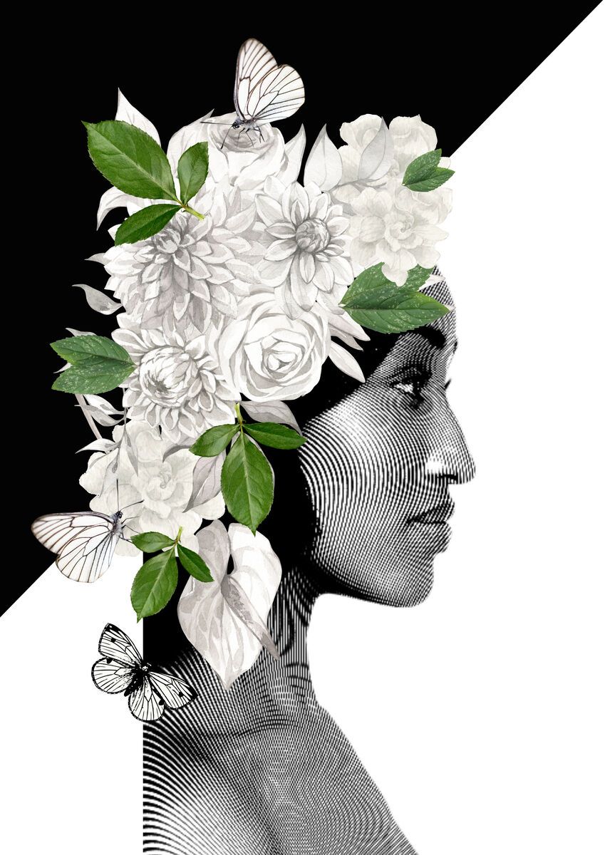 Vrouwengezicht met bloemen in zwart wit en groene bladeren. Getoonde prijs is voor canvas 50 x 70 cm. Andere materialen en formaten verkrijgbaar.