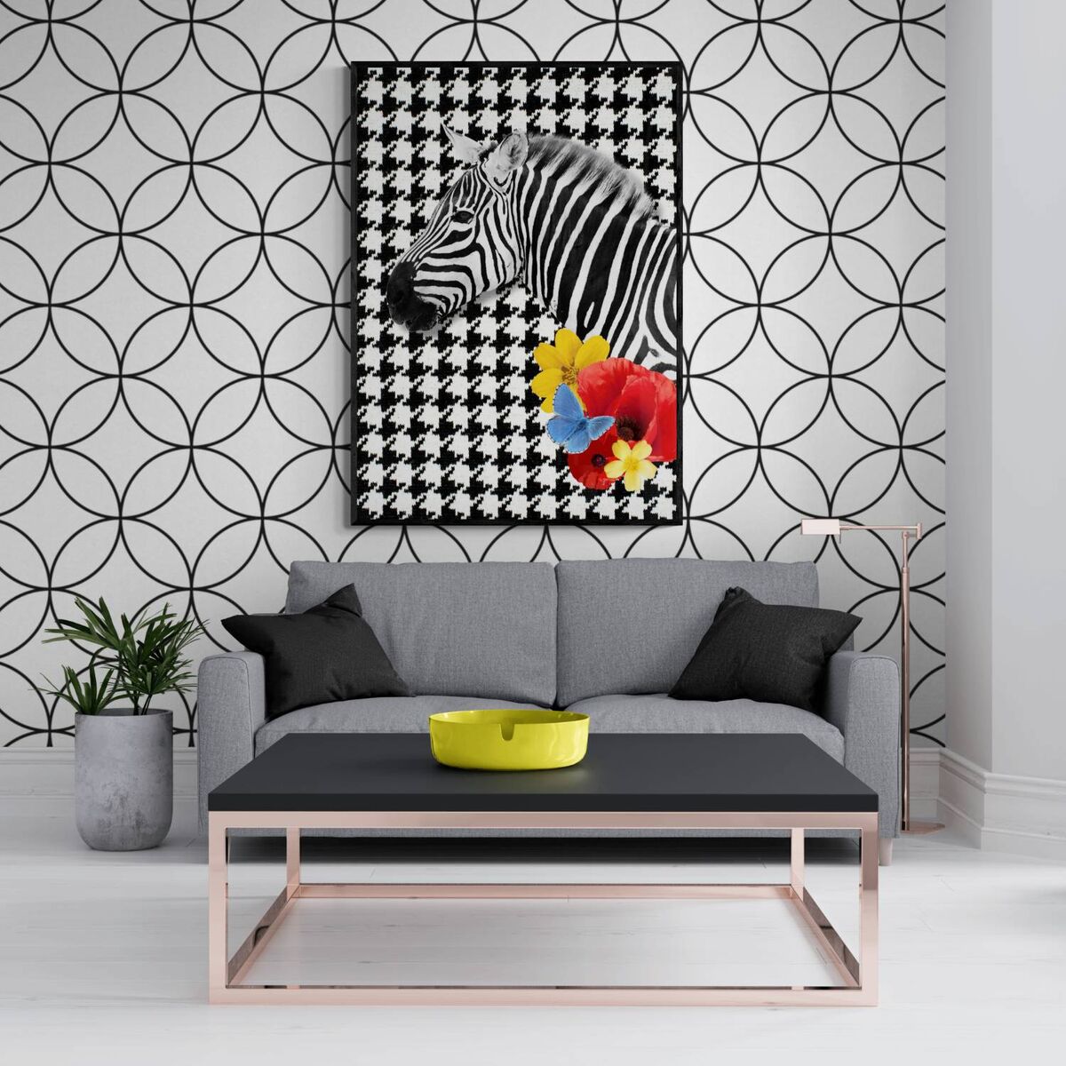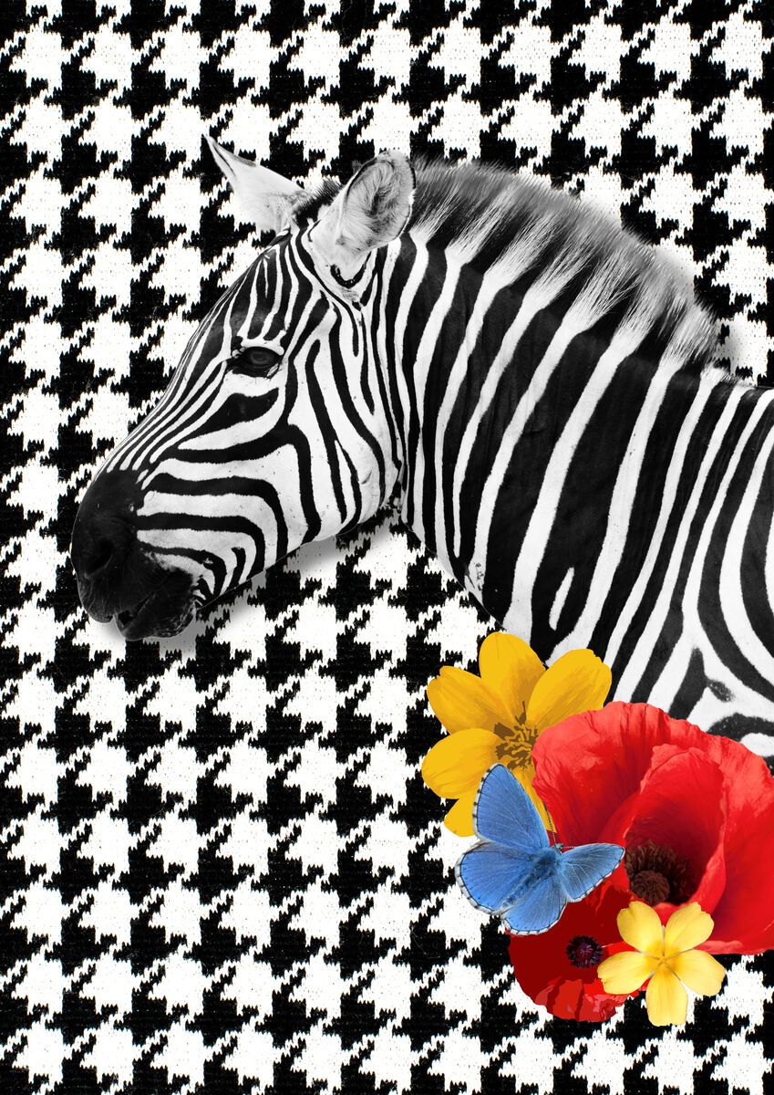 Zebrakop met pied de poule ruitjes achtergrond en bloemen in primaire kleuren. Getoonde prijs is voor canvas 50 x 70 cm. Andere materialen en formaten verkrijgbaar.