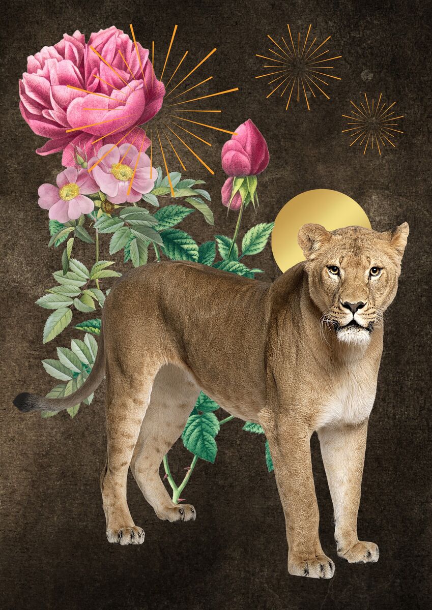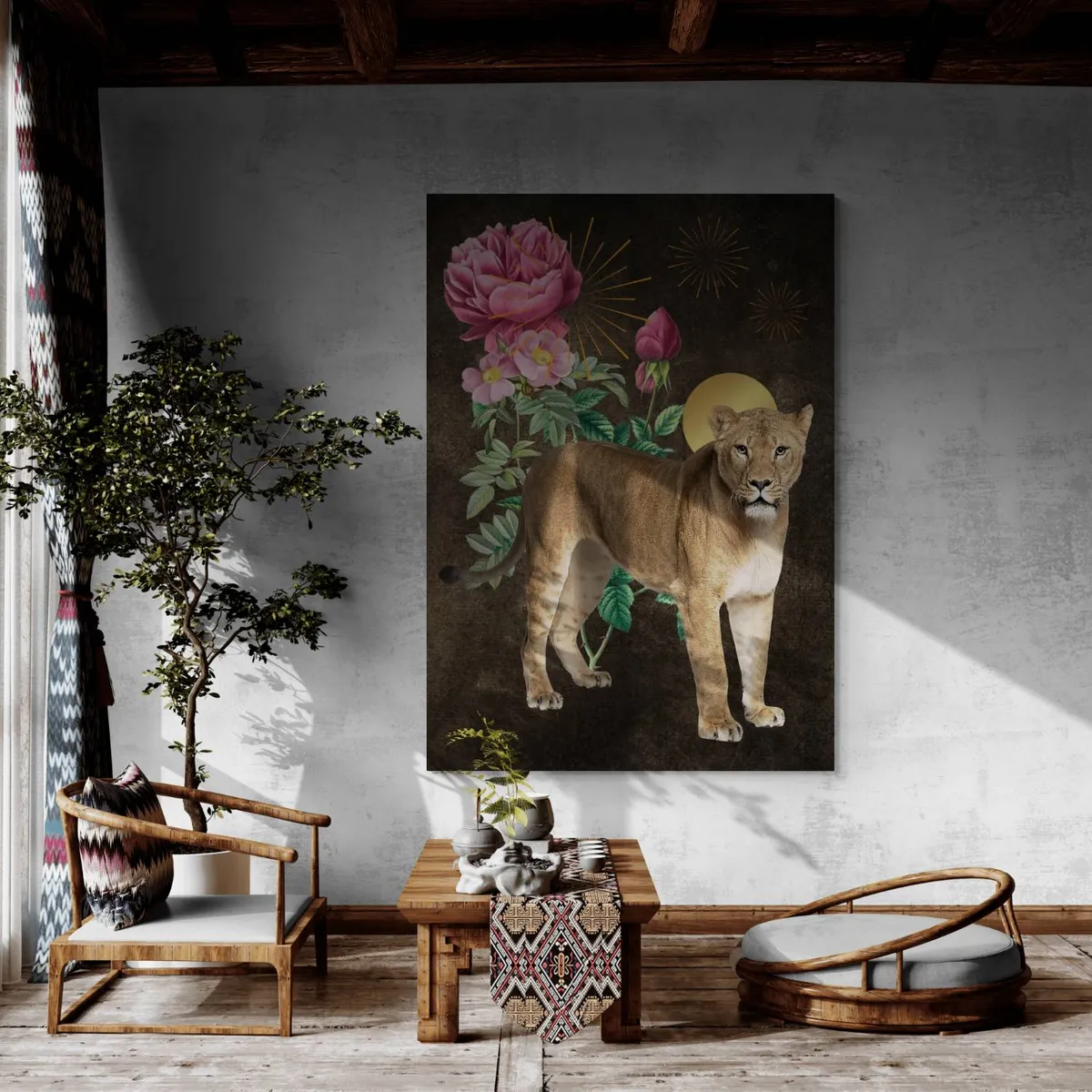 Leeuwin met roze rozen in vintage style. Getoonde prijs is voor canvas 50 x 70 cm. Andere materialen en formaten verkrijgbaar.