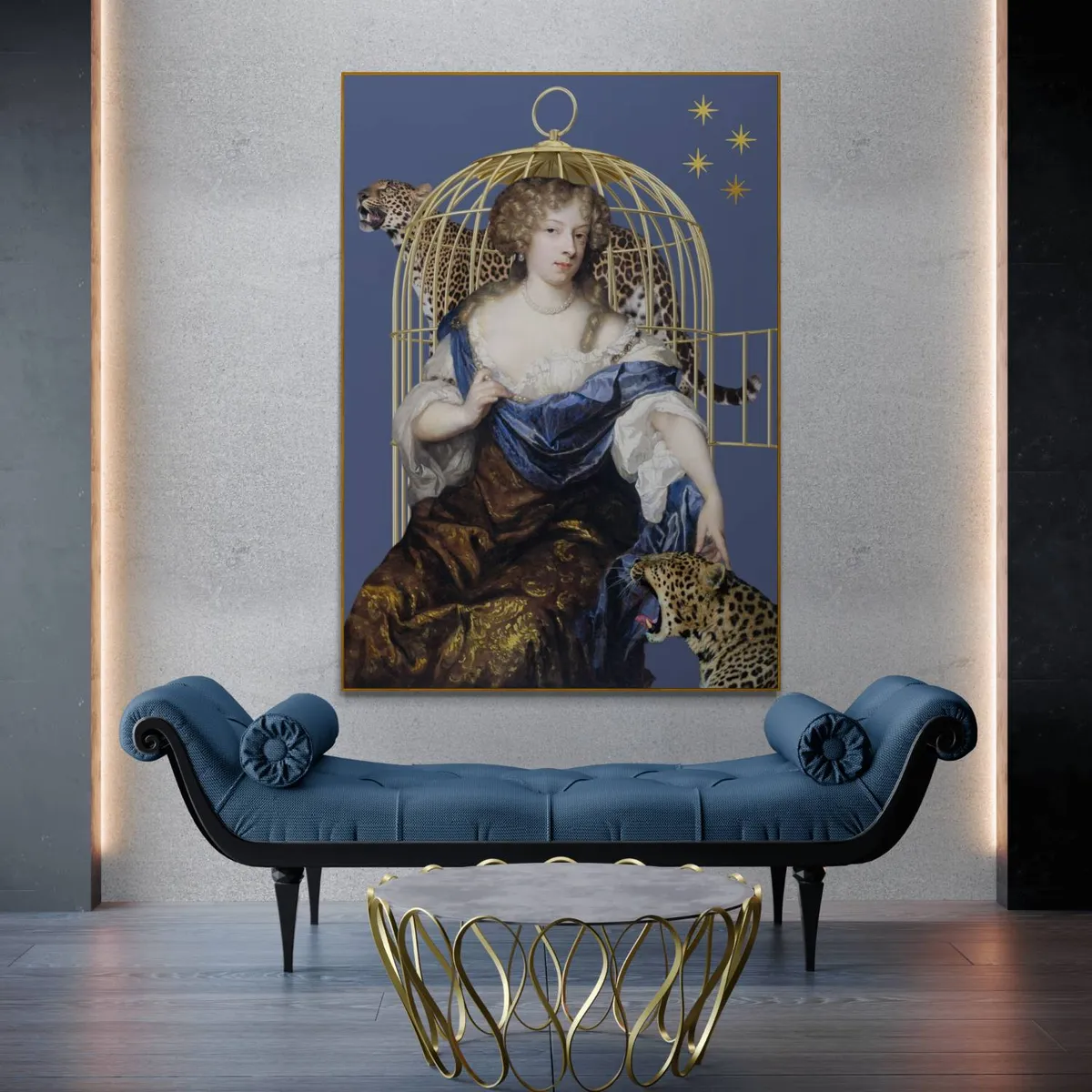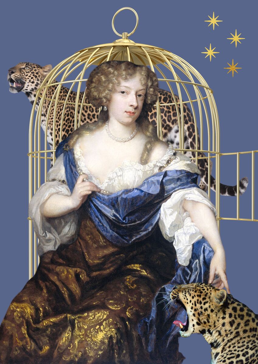 Vrouw van oud schilderij met gouden kooi en luipaarden. Getoonde prijs is voor canvas 50 x 70 cm. Andere materialen en formaten verkrijgbaar.