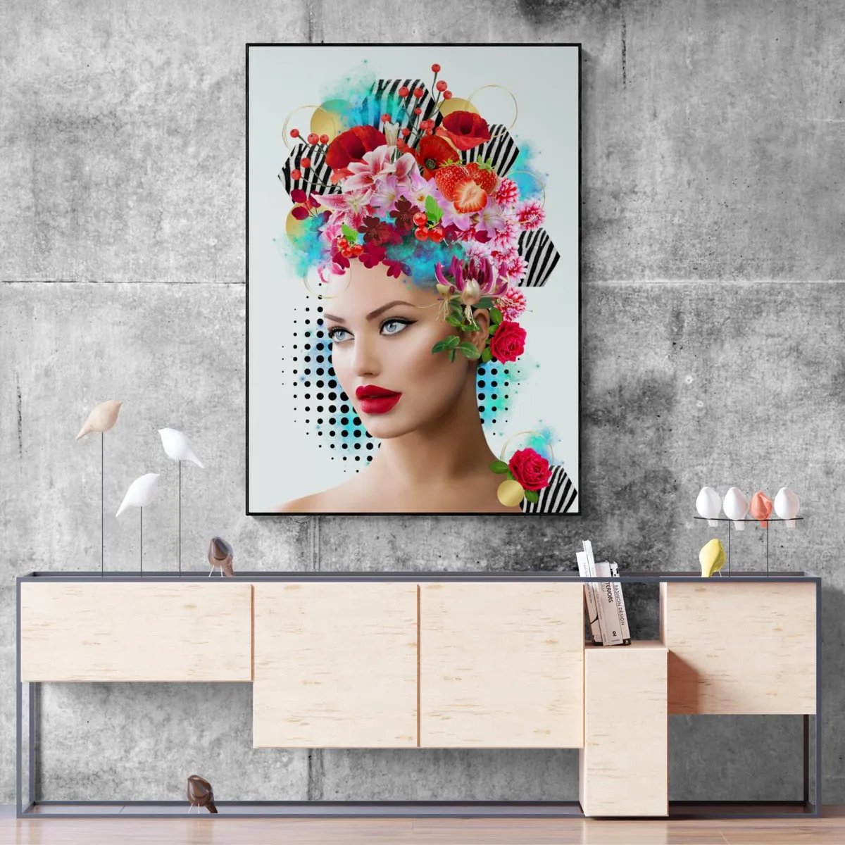 Vrouwen gezicht met bloemen op haar hoofd in rood, roze, fuchsia, blauw, goud en zebra print. Getoonde prijs is voor canvas in 50 x 70 cm. Meer materialen en formaten verkrijgbaar.