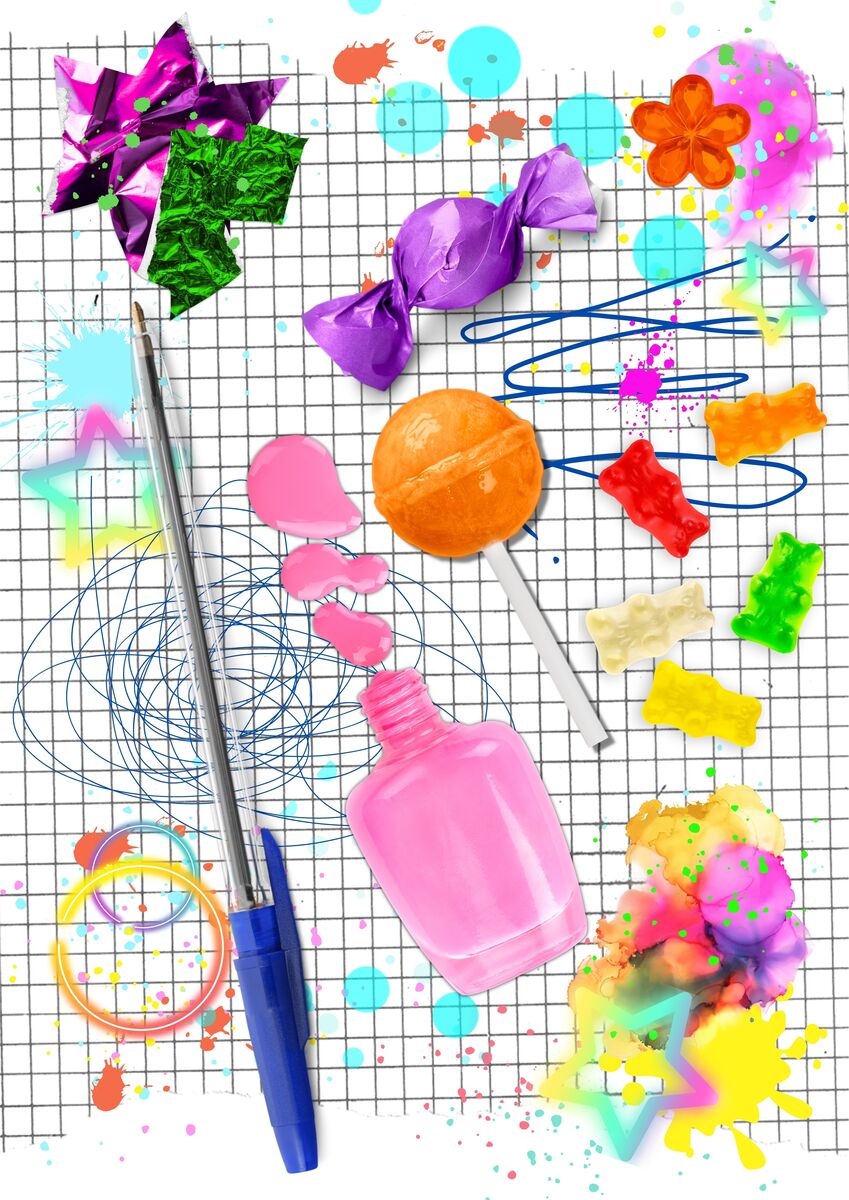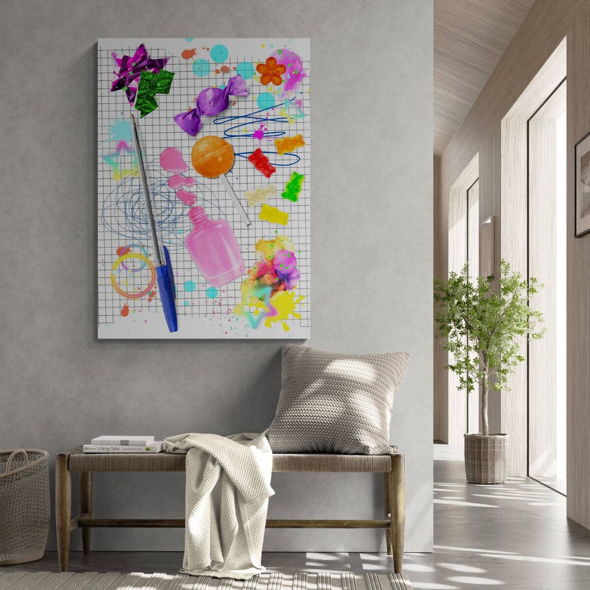 Collage van een kladblok met snoepjes, nagellak en pen in 80's style. Getoonde prijs is voor canvas 50 x 70 cm. Andere materialen en formaten verkrijgbaar.