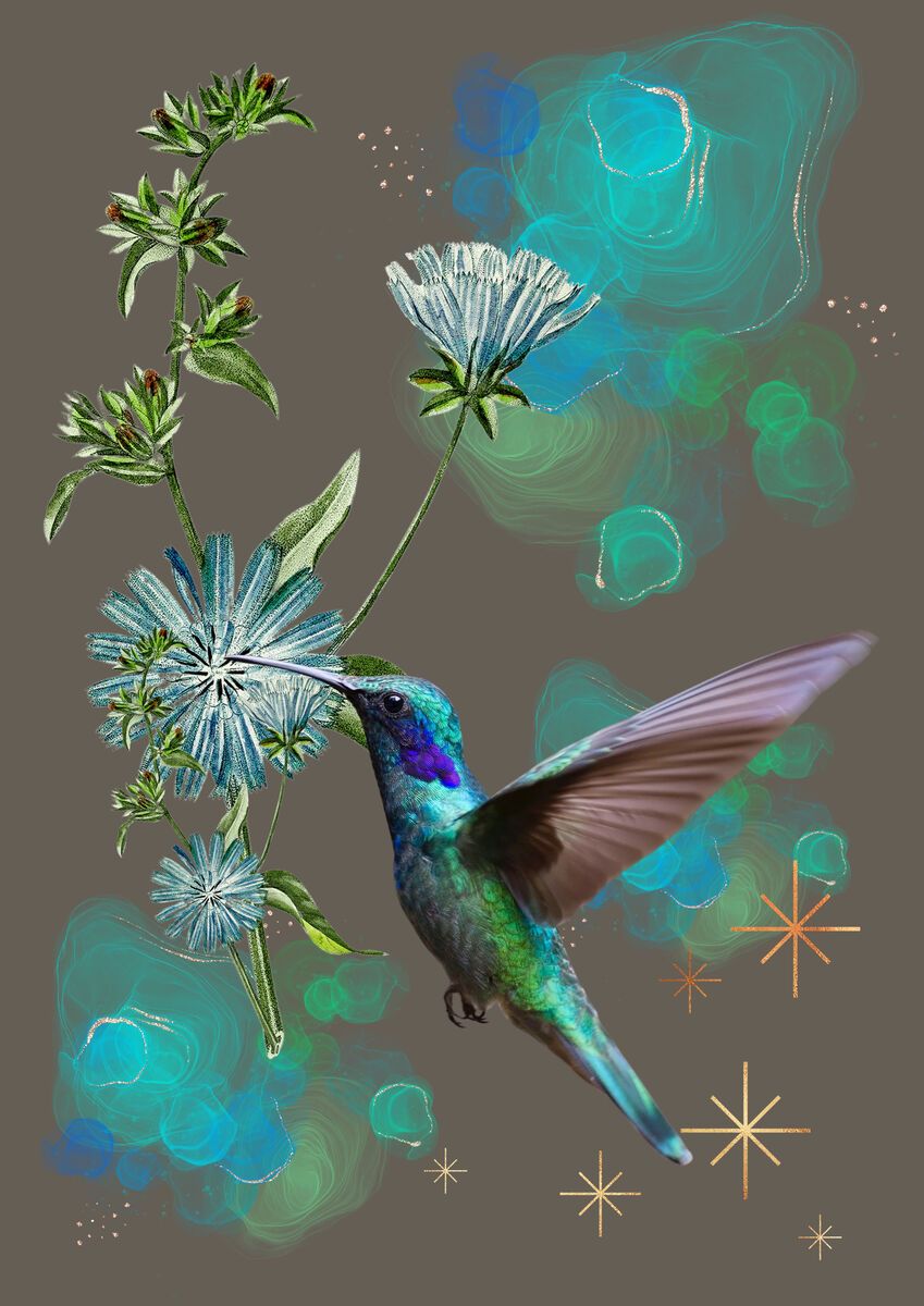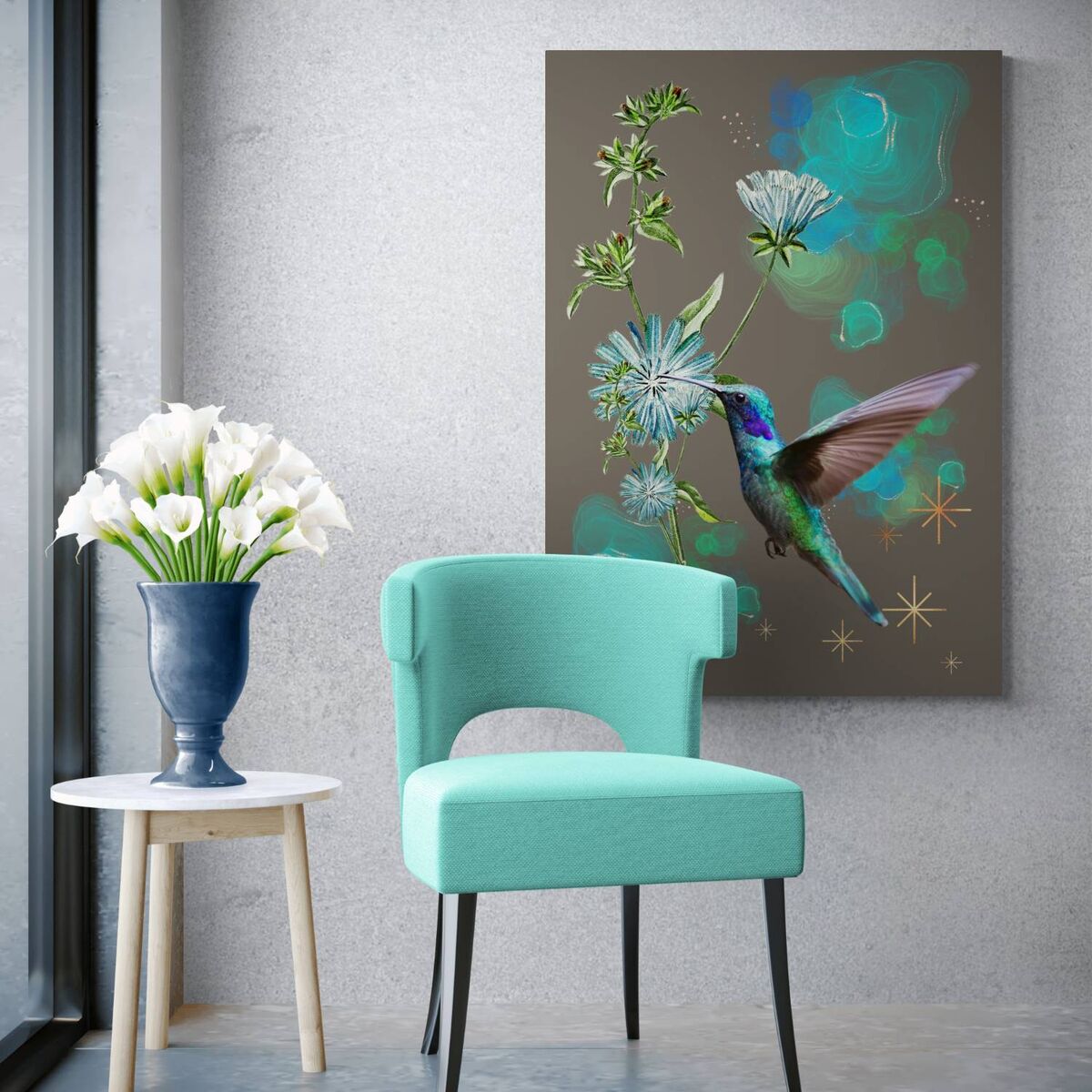 Groen blauwe kolibrie met blauwe bloemen in vintage style. Getoonde prijs is voor canvas 50 x 70 cm. Andere materialen en formaten verkrijgbaar.