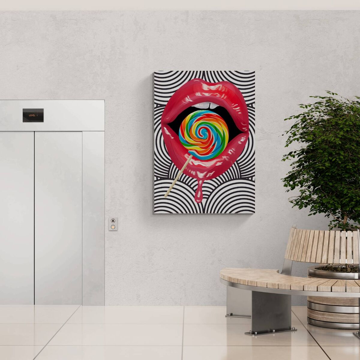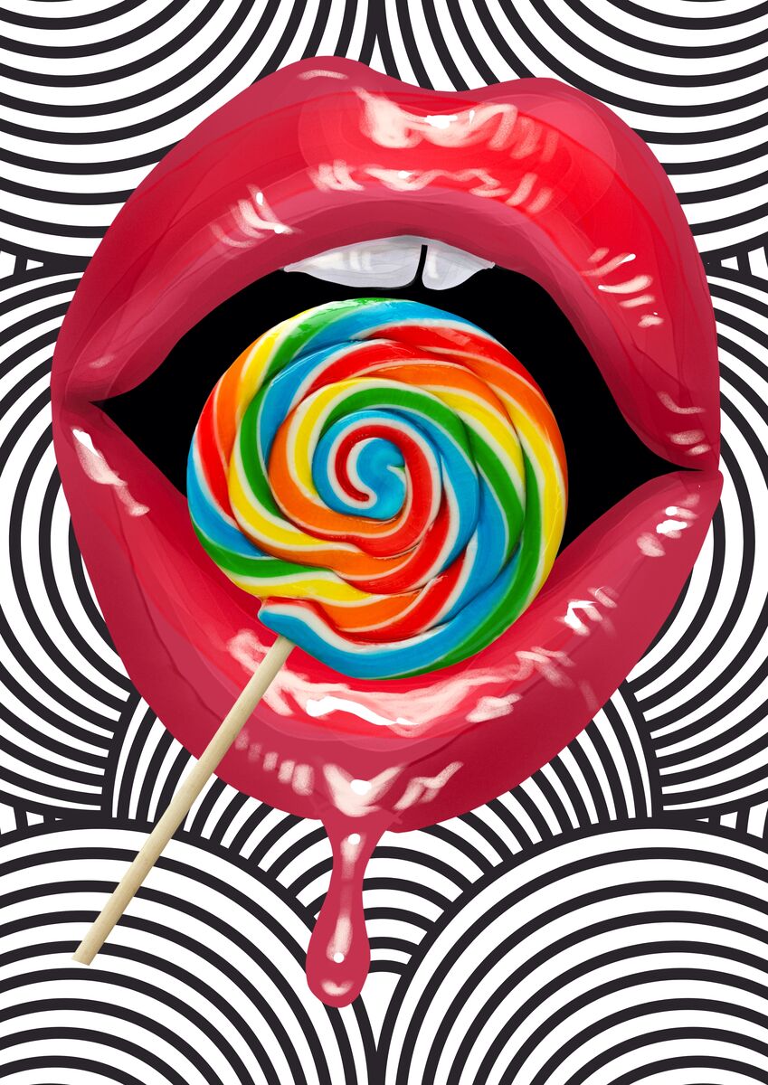 Rode lippen met een lolly in regenboogkleuren op een zwart witte achtergrond in 80's style. Getoonde prijs is voor canvas 50 x 70 cm. Andere materialen en formaten verkrijgbaar.
