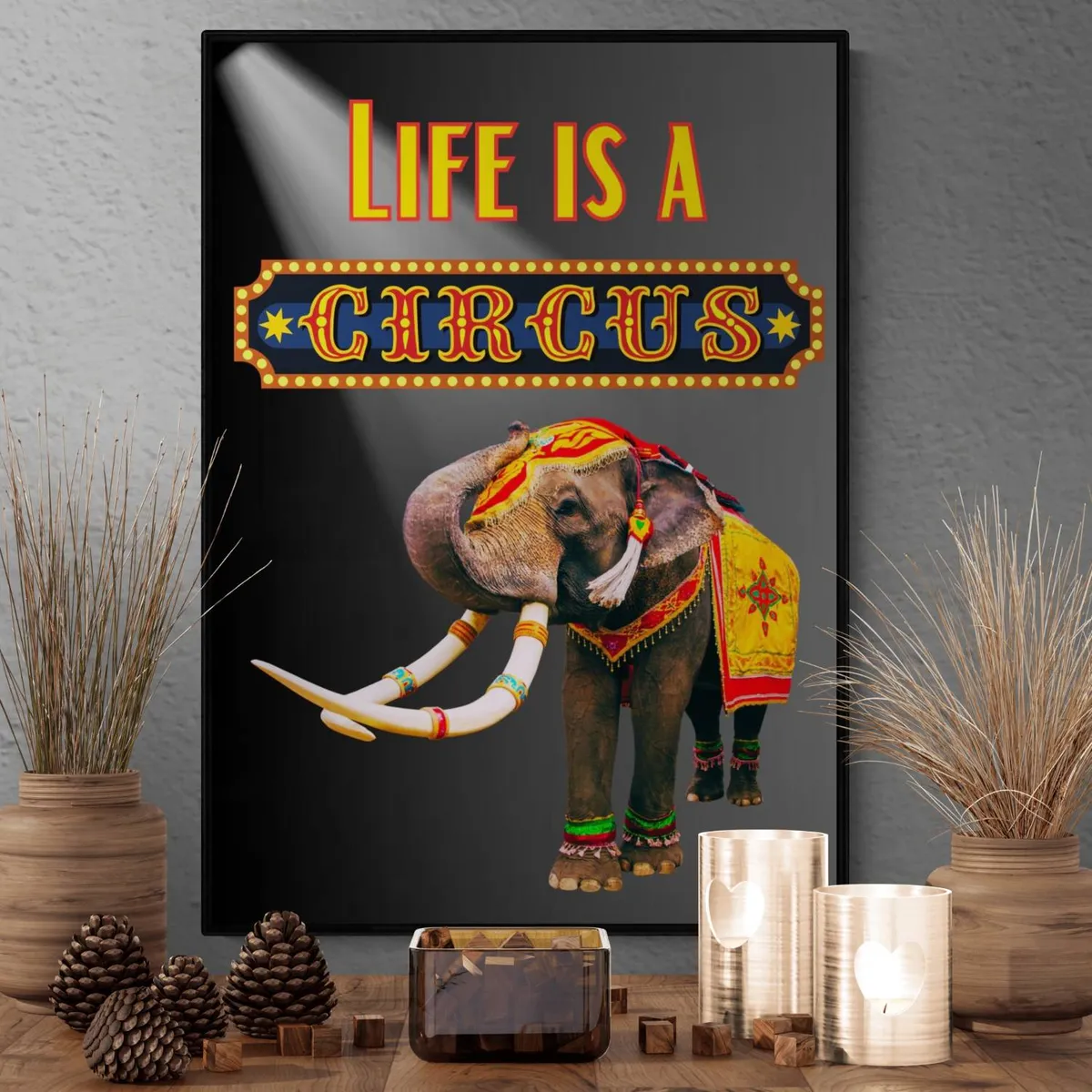 Circus olifant met versiering en tekst. Getoonde prijs is voor canvas 50 x 70 cm. Andere materialen en formaten verkrijgbaar.