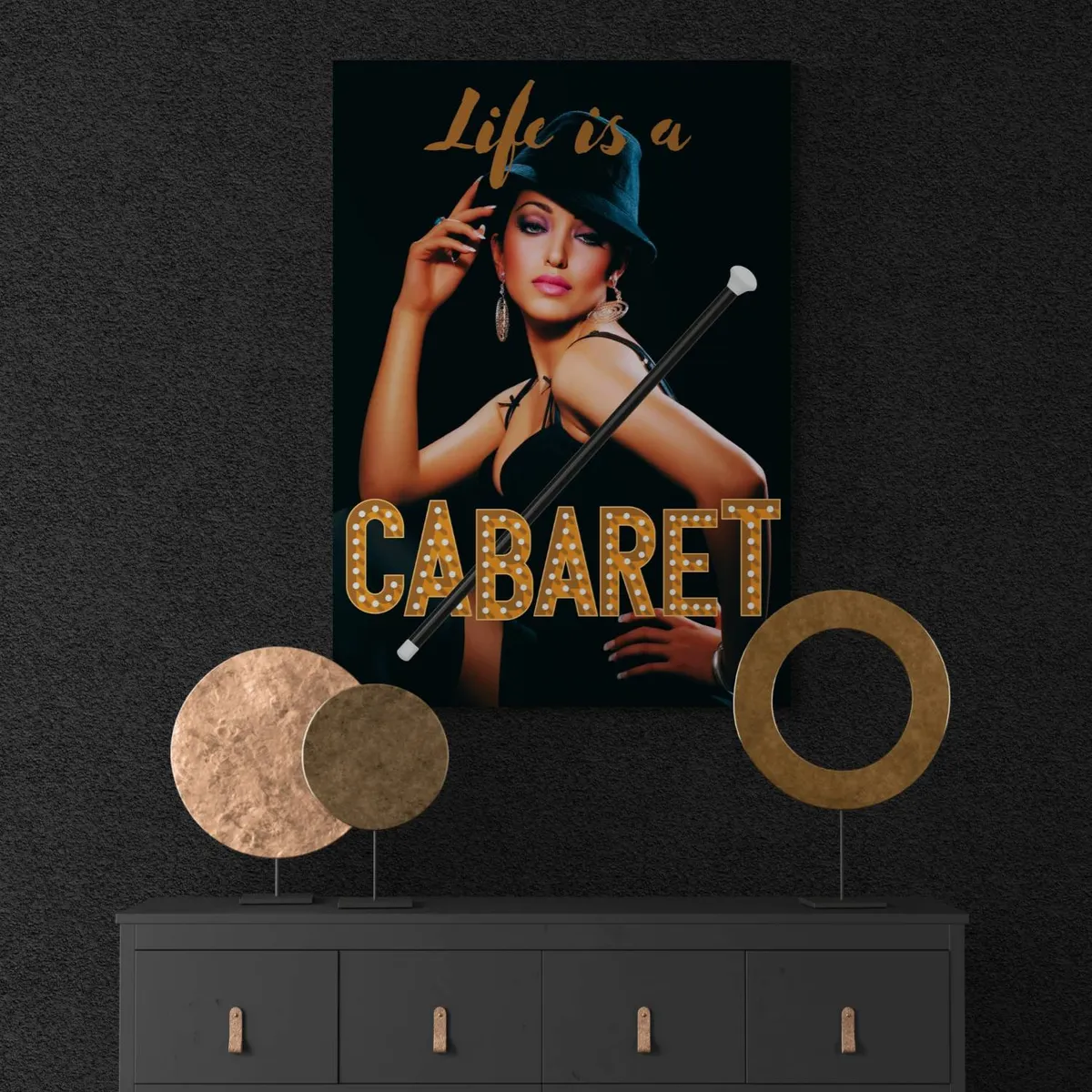 Vrouw in burlesque look met tekst life is a cabaret. Getoonde prijs is voor canvas 50 x 70 cm. Andere materialen en formaten verkrijgbaar.