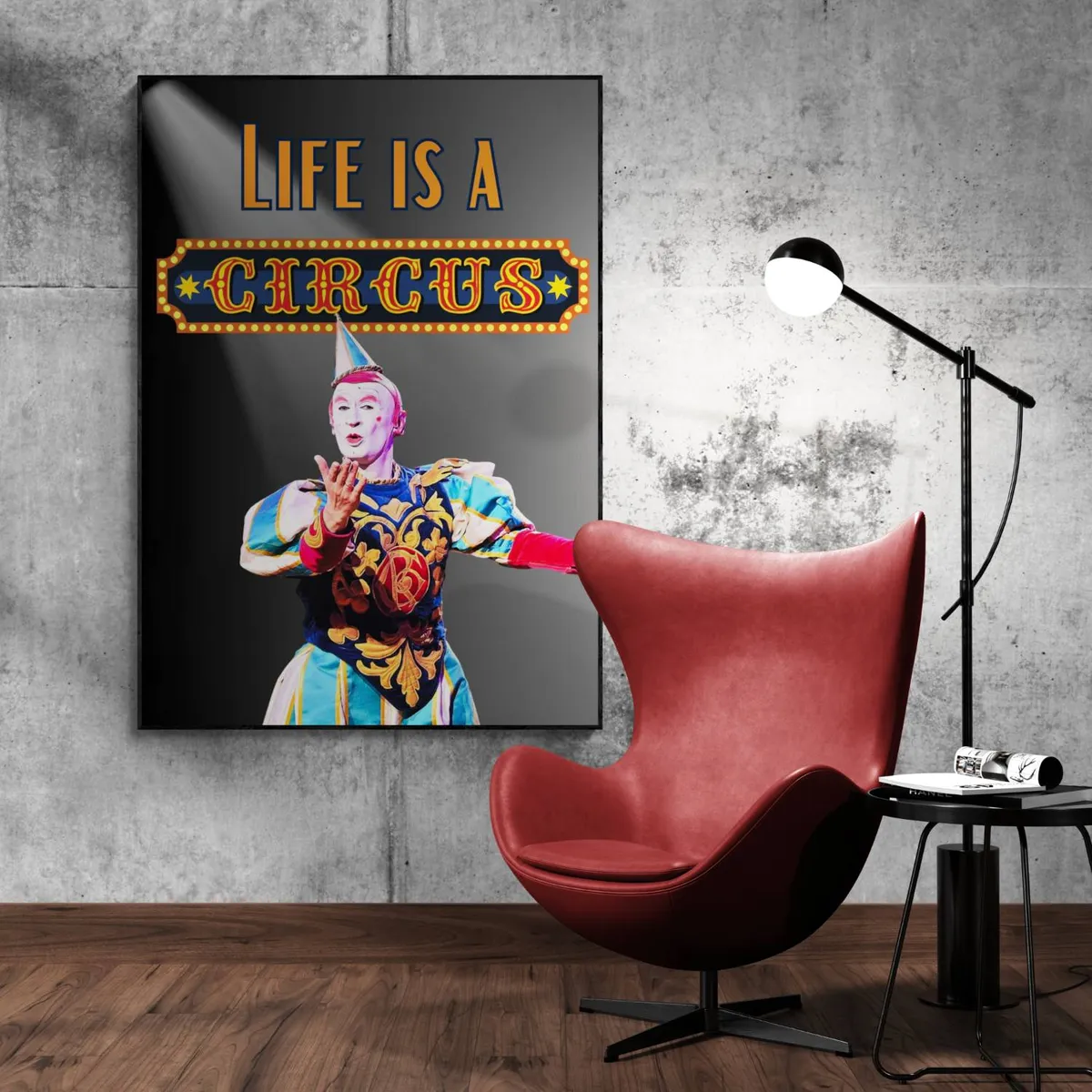 Circus clown met tekst life is a circus. Getoonde prijs is voor canvas 50 x 70 cm. Andere materialen en formaten verkrijgbaar.