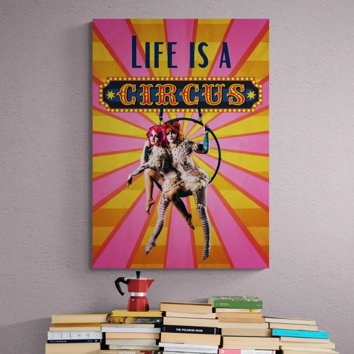 Vrouw met gekleurd kostuum aan trapeze met tekst. Getoonde prijs is voor canvas 50 x 70 cm. Andere materialen en formaten verkrijgbaar.