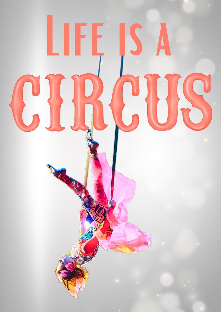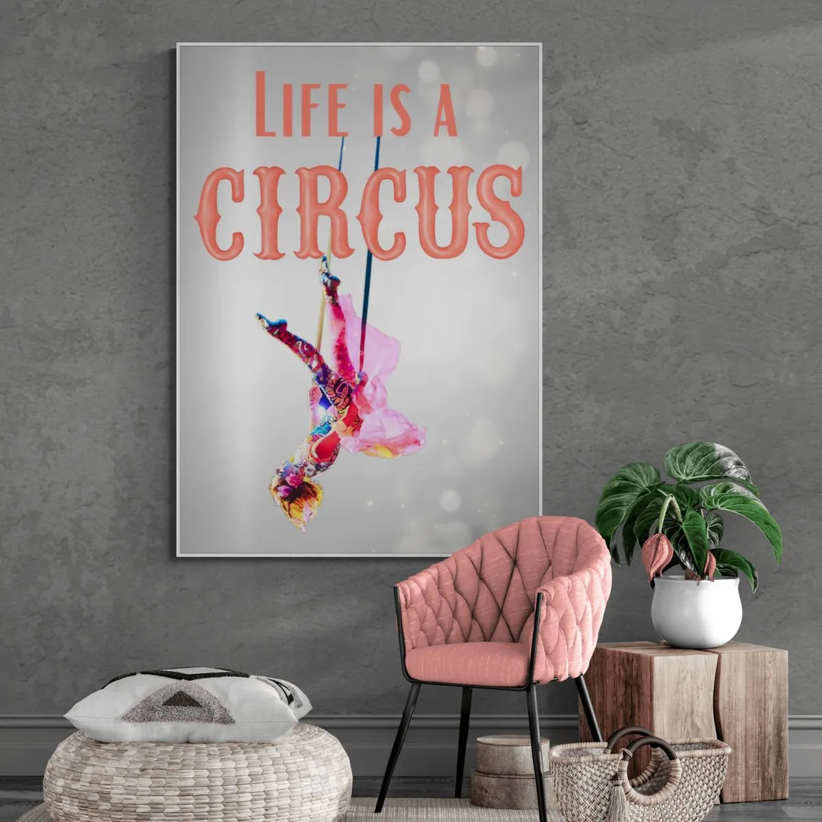 Vrouw met gekleurd kostuum aan trapeze met tekst. Getoonde prijs is voor canvas 50 x 70 cm. Andere materialen en formaten verkrijgbaar.