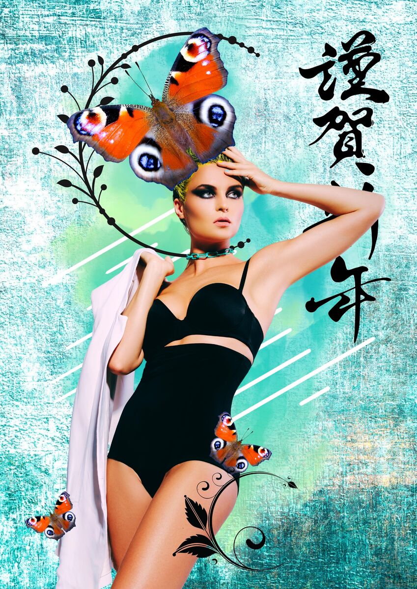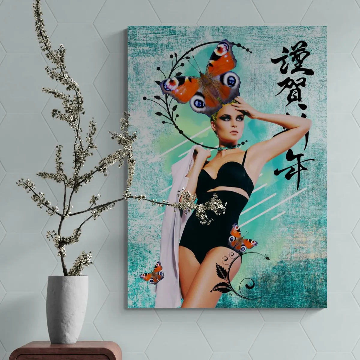 Vrouwelijk model op blauwe achtergrond met Oosterse lettertekens. Getoonde prijs is voor canvas 50 x 70 cm. Andere materialen en formaten verkrijgbaar.