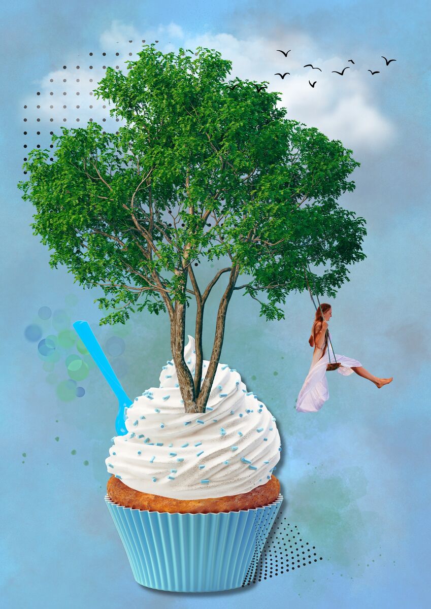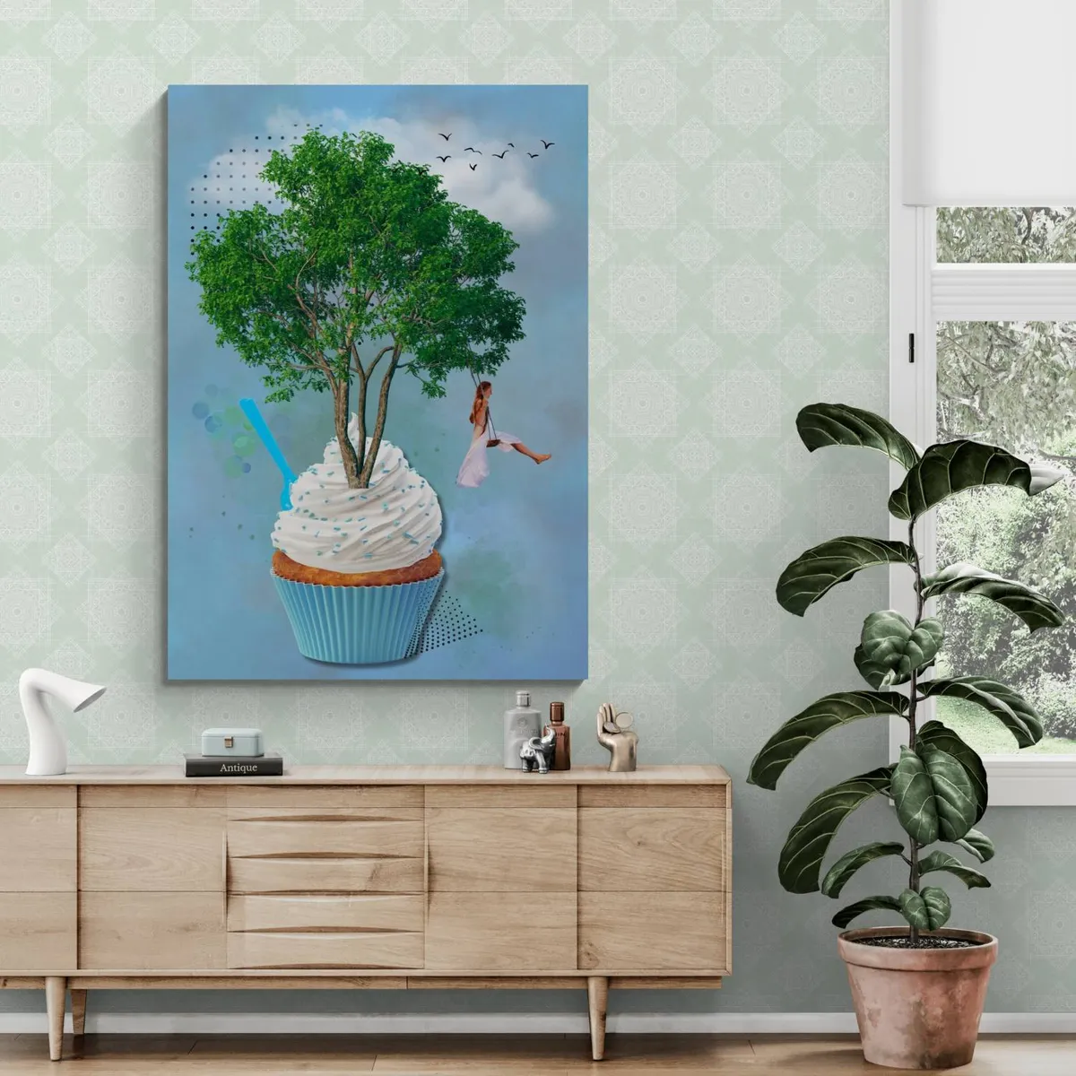 Cupcake met boom waarin een vrouw op een schommel zit. Getoonde prijs is voor canvas 50 x 70 cm. Andere materialen en formaten verkrijgbaar.