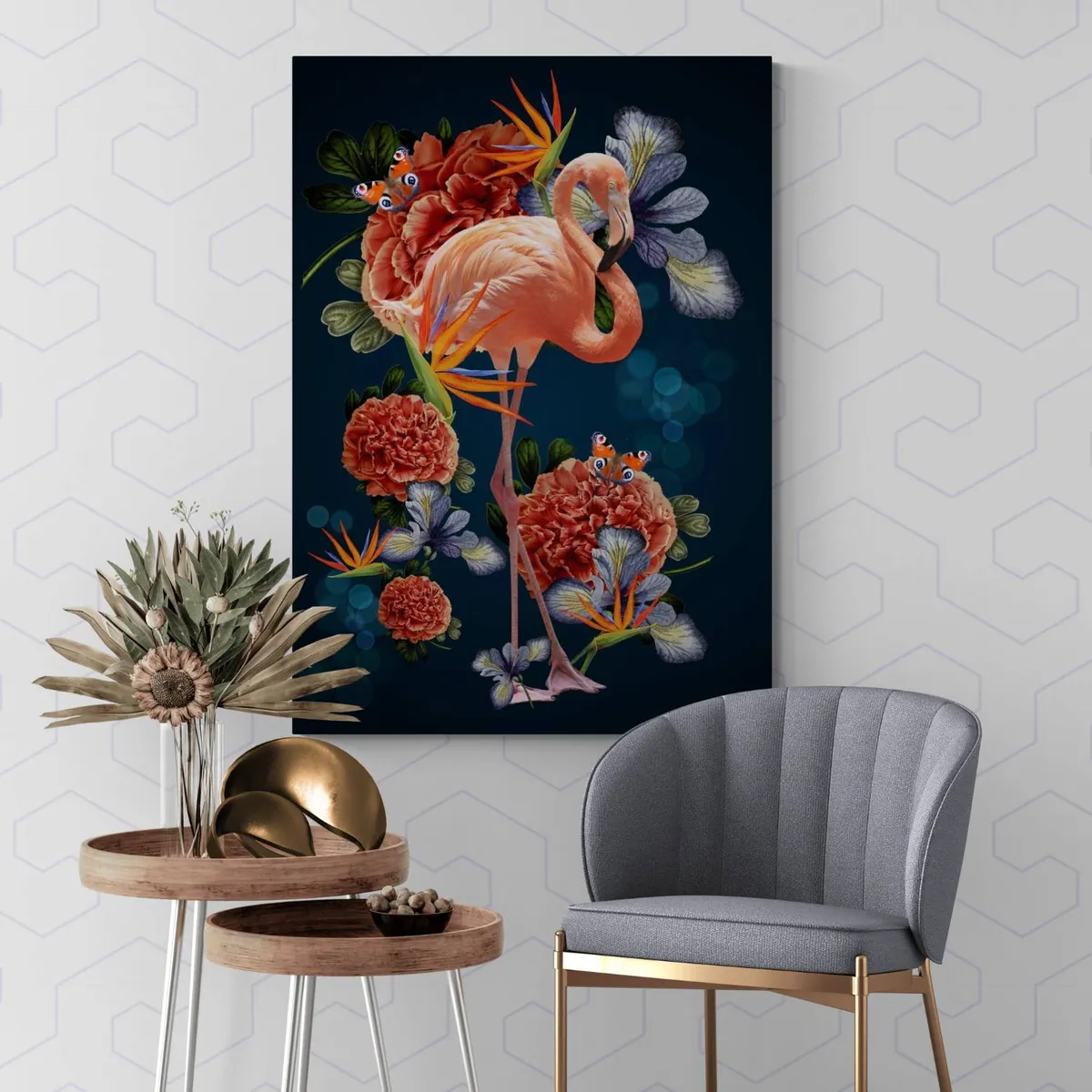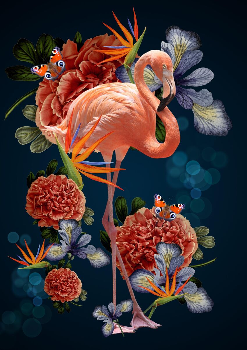 Flamingo met bloemen in vintage style. Getoonde prijs is voor canvas 50 x 70 cm. Andere materialen en formaten verkrijgbaar.