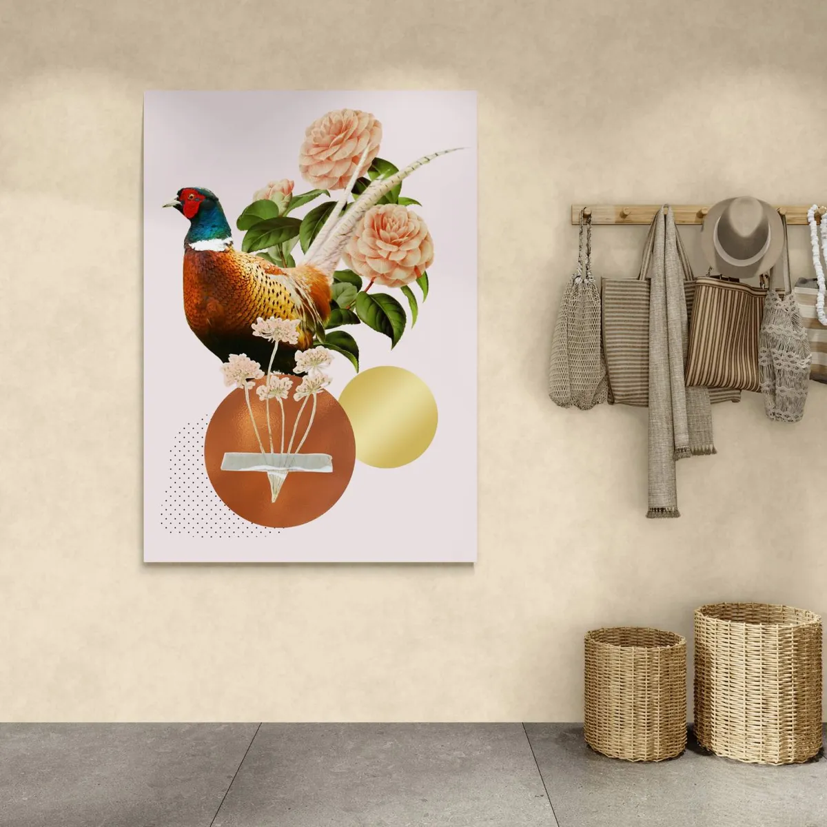 Fazant met vintage elementen op zacht roze achtergrond. Getoonde prijs is voor canvas 50 x 70 cm. Andere materialen en formaten verkrijgbaar.