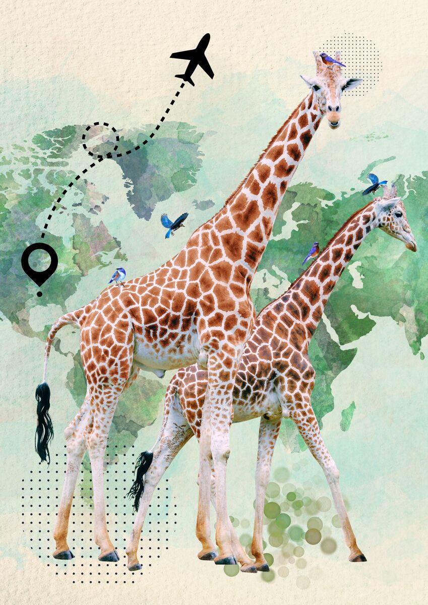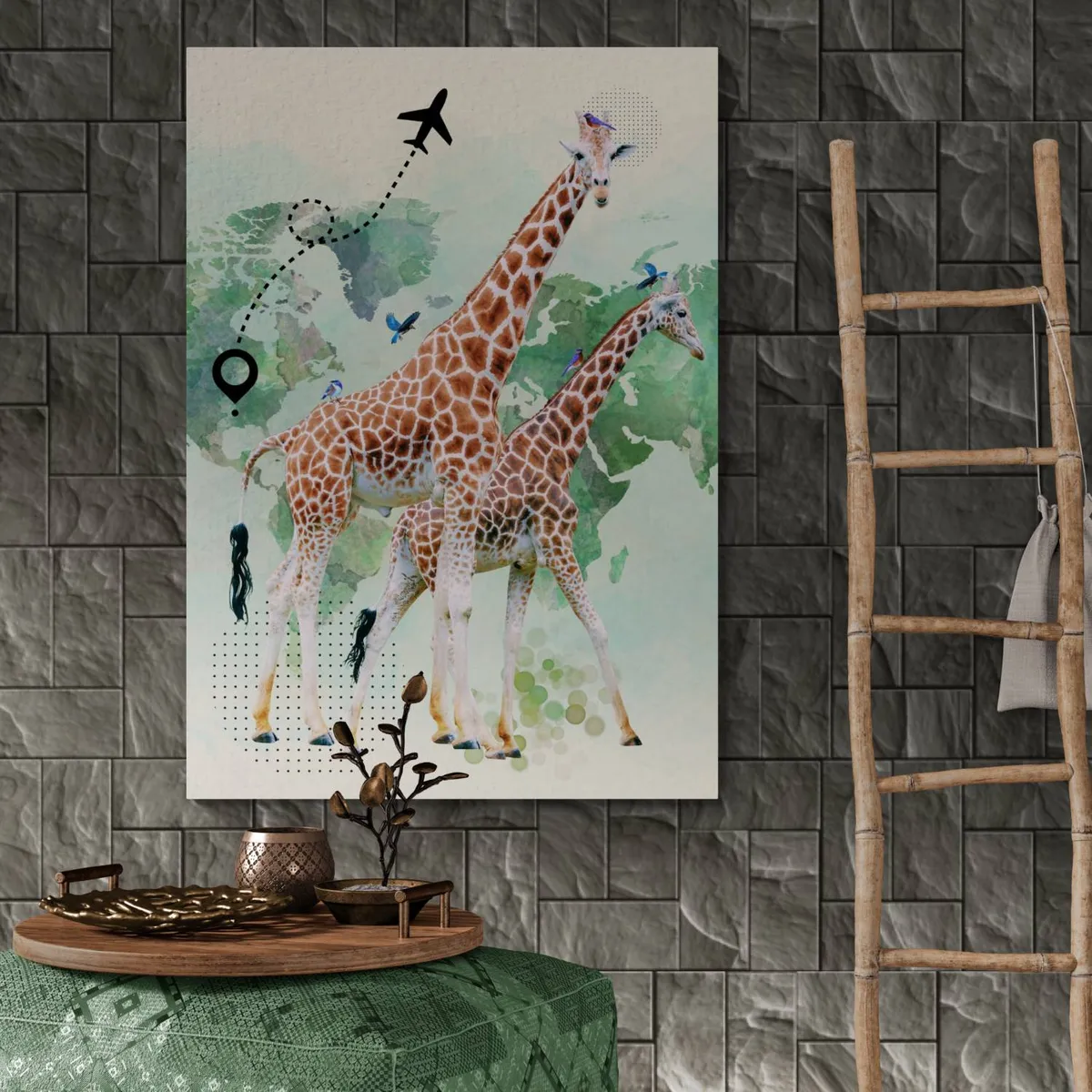 Giraffen duo met op de achtergrond een landkaart in groene tinten. Getoonde prijs is voor canvas 50 x 70 cm. Andere materialen en formaten verkrijgbaar.