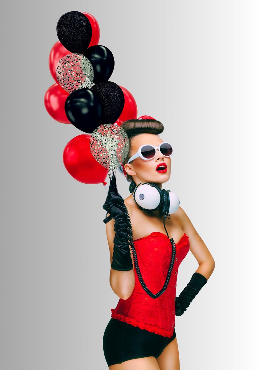 Vrouw met ballonnen in zwart, wit en rood in pinup style. Getoonde prijs is voor canvas van 50 x 70 cm. Meer materialen en formaten verkrijgbaar.