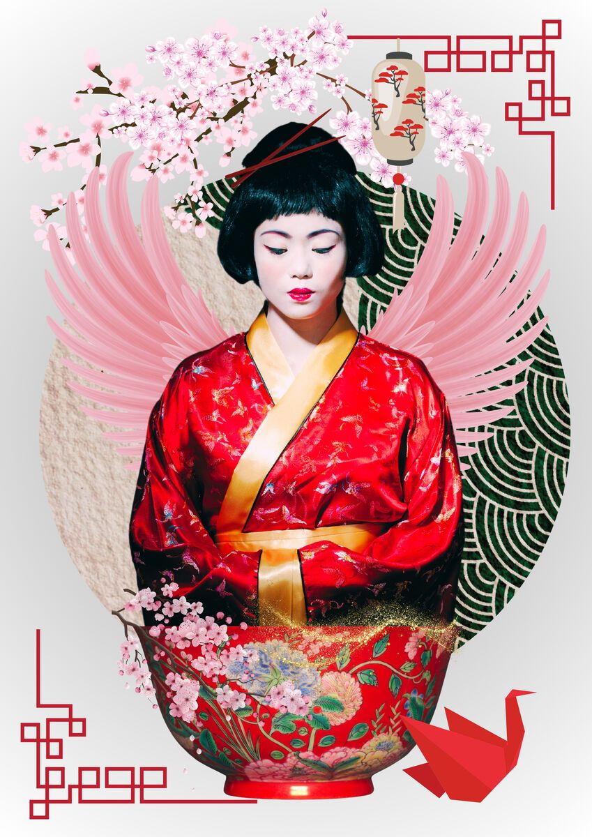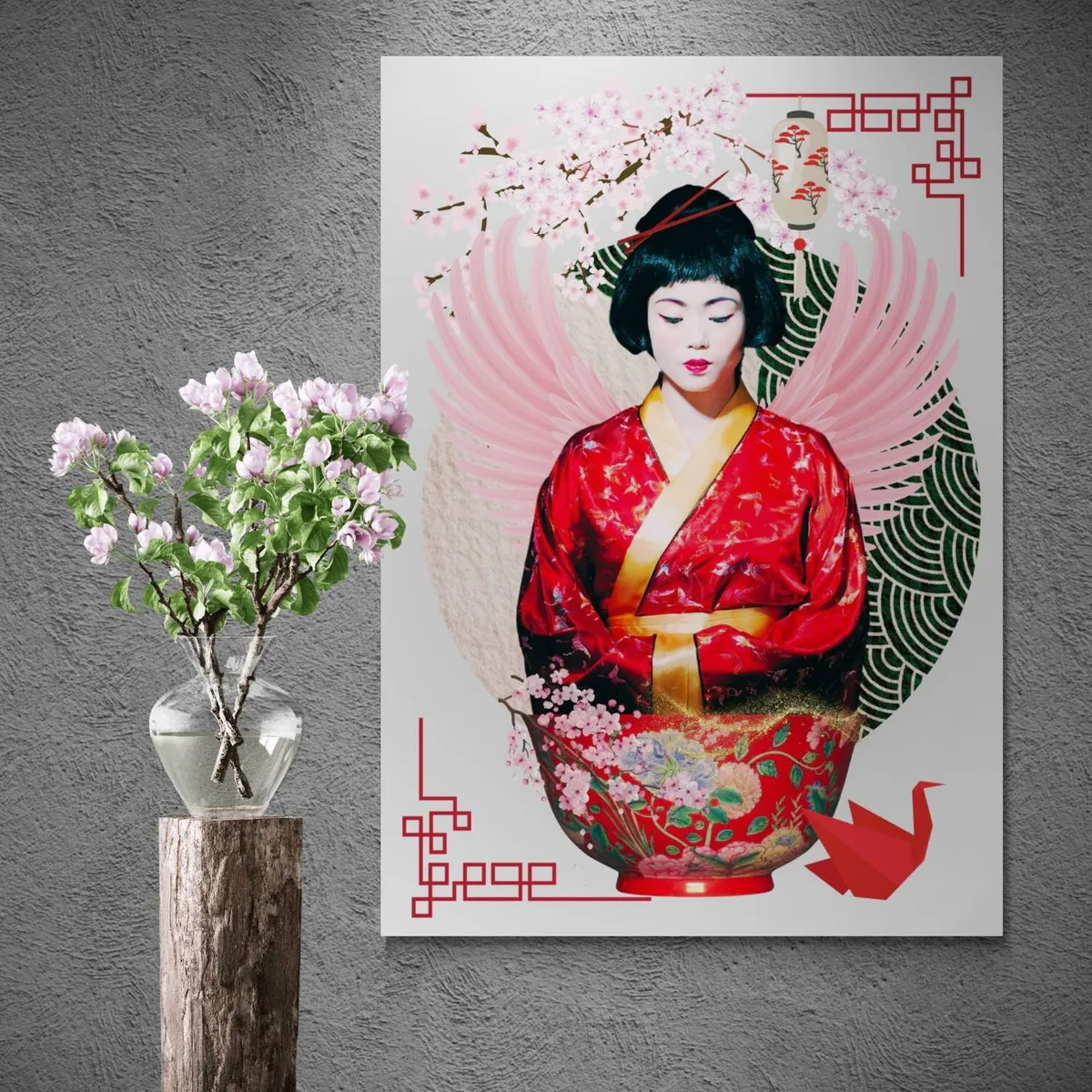 Geisha met roze vleugels in een rode kom met roze kersen bloesem en origami. Getoonde prijs is voor canvas 50 x 70 cm. Andere materialen en formaten verkrijgbaar.